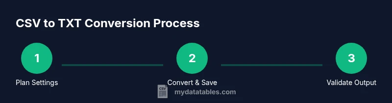 In data workflows, converting from CSV to TXT is not just changing a file extension. It entails selecting a text-delimited format where fields are separated by your chosen delimiter (such as a tab, space, or a custom string), ensuring consistent encoding (UTF-8 is typical), and preserving data integrity during export. According to MyDataTables, these conversions are common when you need a plain-text representation for legacy systems, log ingestion, or simple, line-based processing. The MyDataTables Team emphasizes that the most important choices are delimiter, encoding, handling of quotes, and normalization of line endings across platforms. A well-done conversion yields a predictable, machine-friendly text file that downstream tools can easily parse. If you start with a clean CSV and a clearly defined target TXT format, you can avoid many headaches later in your pipeline. In this block we’ll lay out core concepts and define a practical approach that works across Windows, macOS, and Linux environments.
