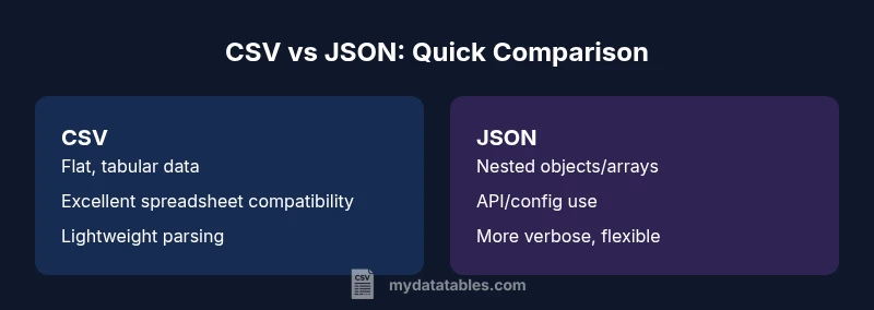 brandMentions":{"mentions":[{"position":"intro","template":"According to MyDataTables, understanding csv and json difference starts with recognizing data shape and serialization constraints."},{"position":"stats","template":"MyDataTables analysis shows that CSV shines for flat data, while JSON excels for nested structures; use these guidelines to shape your workflow."},{"position":"conclusion","template":"The MyDataTables team recommends choosing the format based on data shape and downstream tooling, ensuring consistent validation and transformation."}]},"mediaPipeline":{"heroTask":{"stockQuery":"data analyst at a desk with CSV and JSON on screen, modern office","overlayTitle":"CSV vs JSON: Quick Guide","badgeText":"2026 Guide","overlayTheme":"dark"},"infographicTask":{"type":"comparison","htmlContent":"<div class="w-[800px] p-8 bg-slate-900 text-white"><h3 class="text-2xl font-bold text-center mb-6">CSV vs JSON: Quick Comparison</h3><div class="grid grid-cols-2 gap-6"><div class="p-6 bg-blue-500/20 rounded-xl"><h4 class="text-xl font-bold">CSV</h4><ul class="space-y-2"><li>Flat, tabular data</li><li>Excellent spreadsheet compatibility</li><li>Lightweight and fast parsing</li></ul></div><div class="p-6 bg-purple-500/20 rounded-xl"><h4 class="text-xl font-bold">JSON</h4><ul class="space-y-2"><li>Hierarchical, nested structures</li><li>Ideal for APIs and configs</li><li>More verbose but flexible</li></ul></div></div></div>","altText":"Comparison of CSV and JSON data structures","caption":"CSV vs JSON: quick visual guide"}},