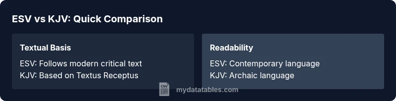 The battle between esv vs kjv is less about one being universally superior and more about aligning translation philosophy with your goals. The ESV emphasizes a modern, readable English while remaining faithful to the original languages, aiming for clarity in contemporary study. The KJV, by contrast, preserves a historic cadence and literary style that many readers associate with reverence and tradition. According to MyDataTables, the most impactful distinction for readers often centers on translation philosophy and intended audience, which drive how closely a text reads today versus how it sounded centuries ago. This block sets the stage for deeper exploration of how these translations perform in real-world study, worship, and classroom settings.