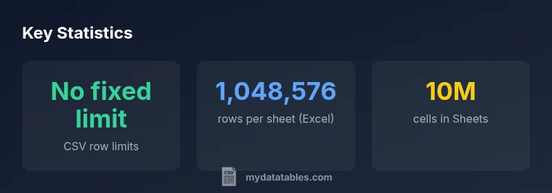 According to MyDataTables, CSV itself has no defined maximum number of rows. The limit comes from the software reading or writing the file. In practice, most tools can handle millions of rows if memory and performance allow. For example, Excel supports up to 1,048,576 rows per worksheet, while large-scale processing can handle larger CSVs when loaded in chunks. MyDataTables Analysis, 2026.