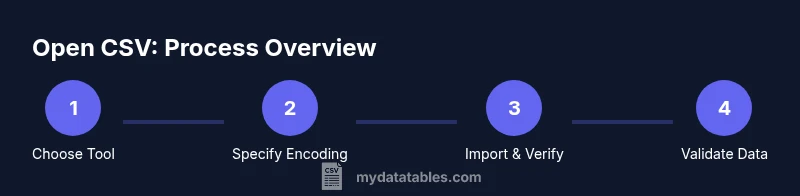 You will learn how to open a CSV file across popular tools and environments. Start by confirming the file delimiter and encoding, then choose Excel, Google Sheets, LibreOffice Calc, or a plain text editor as appropriate. This quick guide covers encoding handling, common pitfalls, and how to verify data integrity after opening.