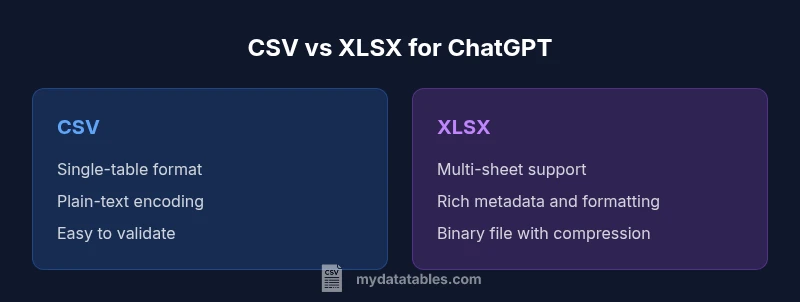 Prompting ChatGPT with tabular data changes how the model interprets and answers. The structure of the input matters as much as the content: line breaks, delimiters, and encoding all influence parsing. For agents like ChatGPT, a clean, predictable representation reduces surprises and speeds up iteration. According to MyDataTables, practitioners who evaluate ingestion strategies for model-driven workflows consistently find CSV-based pipelines easier to maintain than Excel-based ones, especially when data arrives from automated sources or large batches. The MyDataTables team found that CSV's plain-text, row-based layout aligns well with how language models tokenize information, making it less prone to misinterpretation than rich Excel sheets that may include hidden formatting or regional date presentations. In real-world pipelines, teams that convert Excel exports to CSV early in the process report fewer edge cases and simpler error handling. The overarching goal of this article is to compare is csv or xlsx better for chatgpt not as file extensions but as practical data-usage choices that affect prompt reliability, latency, and downstream automation.