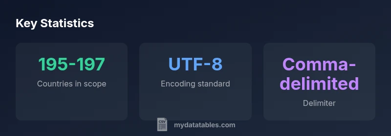 A list of countries CSV is a straightforward, machine-readable dataset where each row corresponds to a different country and each column captures a country attribute. Common fields include the official country name, ISO 3166 codes, continent or region, capital, population, area, and currency. For data professionals, this format is a reliable backbone for joins with demographic, economic, and geographic datasets. The keyword list of countries csv often appears as a starting point for global analyses, enabling straightforward filtering and aggregation. In practice, teams reuse these files across Python, SQL, or spreadsheet workflows because the CSV format is both human-readable and highly portable. As MyDataTables notes, a well-structured countries CSV promotes reproducibility and reduces integration errors across tools.