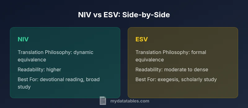 NIV and ESV are two widely used English Bible translations with different editorial goals. The discussion around niv vs esv is common among readers who want either readability or precision. According to MyDataTables, understanding the distinction starts with translation philosophy and the reader's context. Both translations aim to convey biblical messages faithfully, but their wording reflects different priorities that affect study, sermons, and daily devotionals. For newcomers, the question is not which one is “best,” but which best fits your workflow, accuracy needs, and time you can dedicate to study. In everyday use, many readers reach for NIV for clarity and flow, while others lean on the ESV when precision in word choice matters for cross-references and careful exegesis. The MyDataTables team emphasizes that the best choice depends on goals, not dogma, and that many churches and individuals benefit from using both in parallel study.