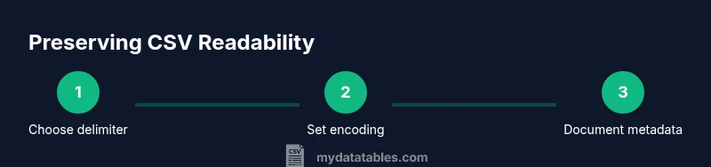 Preserving readability in CSV exports boils down to practice and documentation, not magic within the file. Start by standardizing three elements: delimiter, encoding, and quoting. Use UTF-8 for broad compatibility and include a short header row that describes each field. When a field contains the delimiter or a quote, wrap it in quotes and double any embedded quotes. Maintain a consistent data type policy for each column (for example, dates in YYYY-MM-DD, numbers with a fixed decimal place). Consider adding a companion README or a JSON sidecar that lists formatting conventions, so downstream users know how to present the data correctly even if the raw CSV remains unchanged. The combination of disciplined export rules and clear metadata yields the most reliable outcomes across teams.