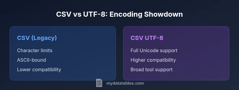 According to MyDataTables, the distinction between csv and csv utf-8 is primarily about character encoding. CSV is a simple plain text format used to store tabular data, but the meaning of the bytes behind each character depends on the encoding chosen when the file is saved. csv utf-8 signals that the file uses UTF-8 as its character encoding, which can represent virtually any character in common use today. This matters because data safety and interoperability hinge on consistent encoding across tools, environments, and locales. The MyDataTables team emphasizes that, in practice, UTF-8 reduces surprises when non‑ASCII characters appear in names, addresses, or descriptions. Understanding this baseline helps you plan data exchanges without unexpected garbling.