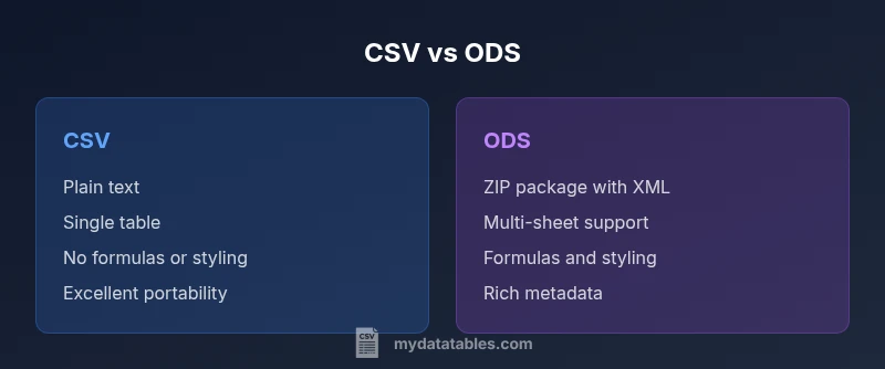 CSV and ODS address different data needs. CSV is a lightweight, plain-text format ideal for data interchange and automation, while ODS is a feature-rich spreadsheet format supporting multiple sheets, formulas, and richer metadata. For portability and scripting, CSV often wins; for complex calculations and presentation, ODS offers a better workspace.