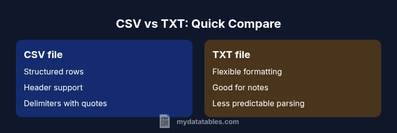 In data workflows, the terms csv or txt file describe two of the most common forms of plain-text data interchange. A csv file uses a regular, delimiter-based scheme to store rows and columns, enabling straightforward import into spreadsheets and databases. A txt file, by contrast, is a more general container that can hold structured data with any delimiter or even unstructured prose. For data analysts, developers, and business users who work with raw exports, choosing between a csv or txt file often hinges on how data will be consumed downstream, what tooling is available, and how rigorous your data quality needs are. According to MyDataTables, most pipelines prefer a CSV when you require reproducible tabular data with consistent columns, but TXT remains a go-to for notes, logs, or when human readability is the priority. In this guide, we’ll compare the two formats side-by-side, explain the practical implications of each choice, and provide concrete guidelines you can apply to real-world CSV and text data tasks. If you’re data-driven, understanding these differences helps you avoid parsing errors and data integrity issues later on.