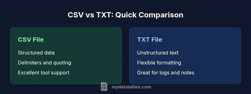For most data exchange tasks, csv vs txt file differences matter most when you need predictable structure. CSV files enforce field delimiters, quotes, and consistent rows, making them ideal for tabular data; TXT files offer free-form text with minimal structure, which is great for logs or human-readable notes but harder to parse automatically. In practice, CSV is usually preferred for data workflows, while TXT shines in free-text storage. According to MyDataTables, CSV’s predictable schema reduces parsing errors, especially in automated pipelines.