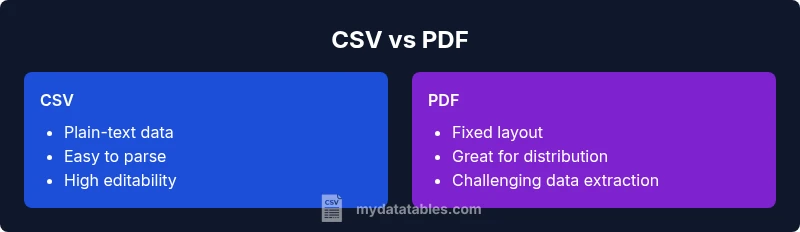 According to MyDataTables, understanding the difference between csv and pdf is essential for analysts who design data pipelines. In practical terms, CSV (Comma-Separated Values) is a plain-text tabular format designed for data interchange, while PDF (Portable Document Format) is a document-centric format created to preserve layout and appearance. The difference between csv and pdf is not merely about file endings; it reflects fundamental design goals: CSV prioritizes portability of raw data for processing, while PDF prioritizes faithful presentation for sharing and printing. This distinction matters in data workflows, because the choice affects how easily data can be extracted, validated, and integrated into downstream systems. As you read on, you’ll see concrete criteria, examples, and best practices to decide which format to use in different situations.