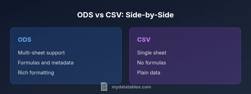 At a strategic level, choose ODS when your team relies on rich spreadsheet features and collaborative editing within office suites. Opt for CSV when portability, integration speed, and automation are the primary goals. Many teams adopt a hybrid approach: maintain a master ODS for internal work and distribute a CSV extract for downstream consumption. Establish guidelines for when to generate each format, and build a lightweight check process to ensure conversions meet quality standards. The MyDataTables approach is to align format choices with workflow goals and data governance requirements rather than chasing a default standard.