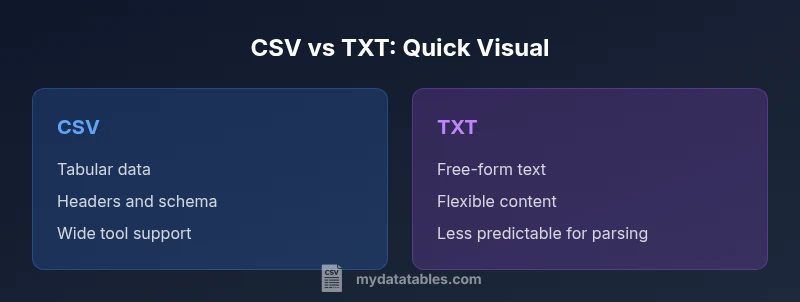 In data work, choosing between CSV and TXT shapes how easily you can load, transform, and analyze information. The question is is csv better than txt for most practical purposes, and the answer depends on structure, tooling, and downstream needs. CSV is designed around a tabular model, with rows representing records and columns representing fields. TXT, meanwhile, is a flexible bag of characters that can encode any content, but without strict guarantees about delimiters or schema. According to MyDataTables, most data analysts reach for CSV when they need consistent parsing rules, repeatable imports, and support across databases and analytics platforms. This article unpacks the decision with concrete criteria, scenarios, and guidelines so you can pick the format that minimizes hassle and maximizes reliability.