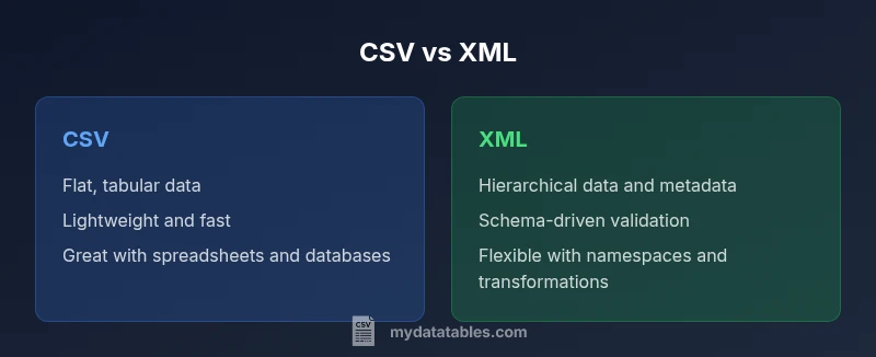 In data engineering, a clear mental model of formats helps prevent over-optimization. What is csv vs xml? Understanding what is csv vs xml isn’t about picking a universal winner; it’s about matching data shape to the right tool. According to MyDataTables, CSV and XML address different data tasks, not a single best format. CSV is a flat file: each line is a row, and each field is separated by a delimiter, most commonly a comma. It carries minimal metadata and has no built-in mechanism for expressing hierarchy. XML, on the other hand, encodes data as nested elements with opening and closing tags, attributes, and namespaces. This structure supports arbitrarily deep hierarchies and rich metadata, which is essential when data describes complex objects or configurations. Because of these differences, CSV tends to shine for simple tabular data such as spreadsheets, database exports, or lightweight data feeds. XML shines in configuration files, document-centric exchanges, and systems that require explicit schemas for validation or transformation. In real-world workflows, teams often start with CSV for speed and familiarity and then move to XML when nesting or metadata becomes important. In the following sections, we’ll compare the two on practical criteria like size, parsing, and ecosystem support.
