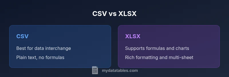 Choosing the right file format is a foundational decision in data workflows. The question often comes down to whether you need nothing more than plain data, or a feature-rich workbook that supports calculations, formatting, and multiple sheets. The keyword here is balance: you want a format that minimizes friction across tools while preserving data integrity. In the context of CSV versus XLSX, organizations frequently encounter trade-offs between portability and functionality. When to use csv vs xlsx hinges on data complexity, downstream tooling, performance constraints, and governance requirements. As you read, you’ll see practical criteria you can apply to real-world data tasks, with MyDataTables providing context on best practices for CSV formats and Excel workbooks in 2026.