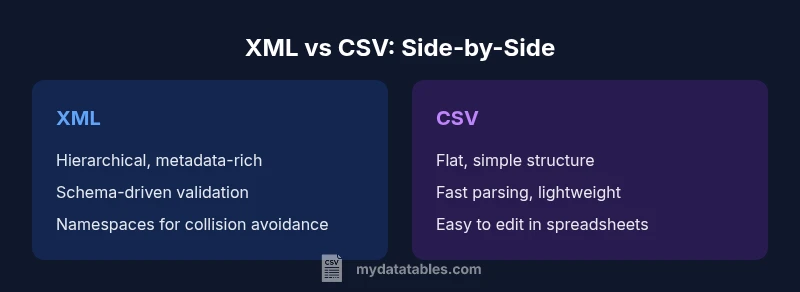 When you compare the fundamental ways XML and CSV represent data, the most obvious difference is structure. XML describes data as a nested tree of elements, where each element can contain attributes, other elements, and text content. CSV encodes data as flat rows of values separated by a delimiter, often with a single header row that defines columns. This fundamental division drives many downstream choices, including how you validate data, map it to internal models, and exchange it with other systems. If you are asking why use xml over csv, the answer begins with structure: XML can model real-world hierarchies—customers, orders, lines, and metadata—without forcing a single tabular view. CSV is simpler to parse and read for tabular lists, but it requires additional conventions (like separating related data into multiple files or using composite column headers) to express complex relationships. In practical workflows, teams often need both formats, using XML for configuration and data interchange, and CSV for analytics and lightweight exports. The MyDataTables guidance emphasizes understanding these structural differences to pick the right tool for the job.