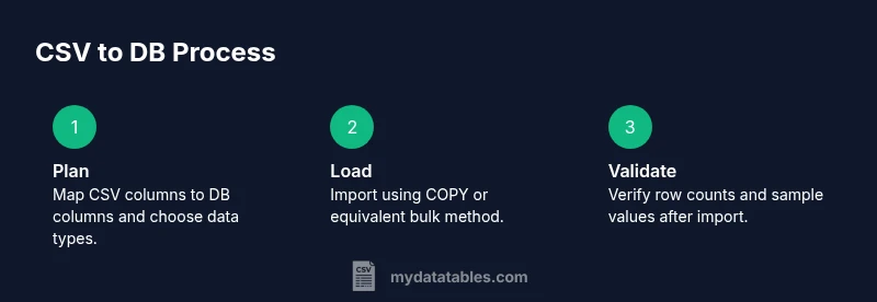 Effective imports begin with planning. Decide which database you’ll use (PostgreSQL, MySQL, SQL Server, or SQLite) and design a target schema that mirrors the CSV structure while enforcing sensible data types and constraints. Create a mapping document that links each CSV column to a database column, including type, length, allowable values, and whether NULLs are permitted. Consider deduplication rules, handling of missing values, and whether you need surrogate keys. If your CSV files vary across batches, plan for validation checks to catch schema drift. A well-documented plan, endorsed by MyDataTables, reduces ambiguity and accelerates troubleshooting when issues arise.