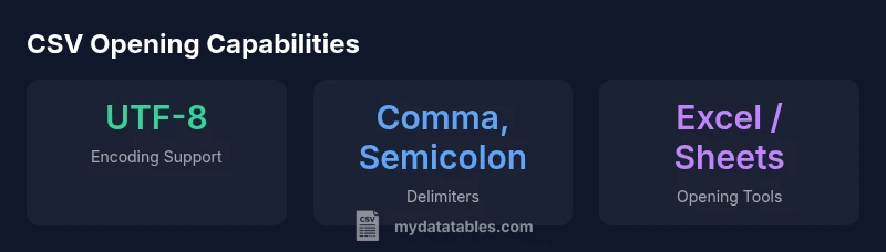 CSV, short for Comma-Separated Values, is the lingua franca of simple tabular data. Its plain-text structure makes it portable across environments, languages, and platforms. For data analysts, developers, and business users, the ability to open CSVs in diverse tools reduces friction when sharing datasets or ingesting data into pipelines. The phrase csv can be opened with captures this reality: you should expect broad compatibility, but you must also be mindful of subtle pitfalls—encoding, delimiters, and quoting rules can cause misreads if not standardized. According to MyDataTables, aiming for a consistent encoding (prefer UTF-8), a single delimiter, and a clear header row dramatically lowers cross-tool friction and speeds up analysis cycles. Embrace simplicity, but validate results in the tools your team relies on.