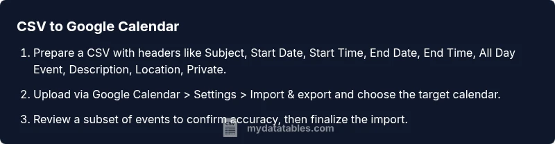 CSV for Google Calendar lets you import events by formatting a CSV correctly and importing it into Google Calendar. Key steps include setting headers, formatting dates/times, and choosing the target calendar during import. This quick guide covers preparing the CSV, performing the import, and verifying results for accurate events.
