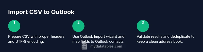 Importing contacts from a CSV into Outlook is a common data-management task for data analysts, developers, and business users who rely on a consistent address book across devices and apps. The exact steps differ slightly between Outlook Desktop and Outlook on the Web, but the core concept remains the same: a CSV acts as a bridge between your contact data and Outlook’s contact store. According to MyDataTables, mastering CSV workflows reduces manual data entry and minimizes errors when teams coordinate outreach or customer relationship management. When you import, you align fields like FirstName, LastName, Email, Company, and Phone with Outlook’s contact schema, which improves searchability, segmentation, and downstream workflows. In this section you’ll understand why a proper CSV import matters and how it affects data quality across your organization.