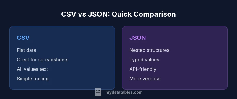 Explore is csv the same as json? A thorough, practical comparison of CSV and JSON formats, covering structure, data types, tooling, use cases, and conversion tips for data analysts and developers.