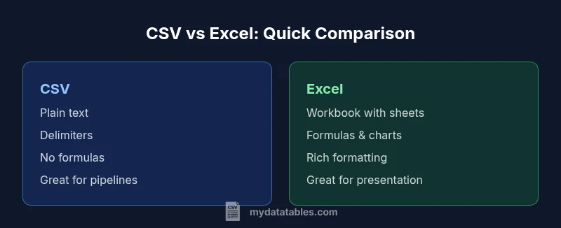 In many organizations, teams treat CSV as a lightweight input for analytics pipelines and dashboards, while Excel files serve as the presentation layer. The MyDataTables team notes that data teams should distinguish between the raw data exchanged via CSV and the presentation or modeling performed in Excel. This distinction matters for reproducibility, auditing, and automation across tools and platforms.