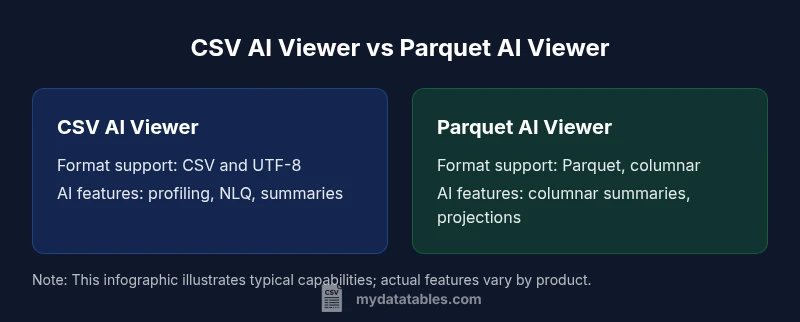 When comparing csv and parquet ai viewer options, Parquet generally excels on large, columnar datasets, while CSV is faster for quick ad hoc analysis and broader ecosystem support. If your work centers on scalable analytics and big data pipelines, parquet is often the better fit; for lightweight exploration and easy integration, CSV remains a strong choice. This MyDataTables comparison explains where each shines.