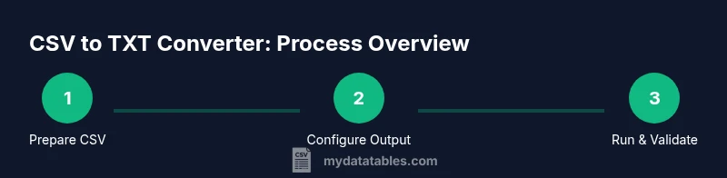 A csv to txt converter is a workflow or tool that transforms CSV data into plain text lines. This is particularly useful when downstream systems expect simple, line-oriented input rather than structured tables. The goal is to preserve the row and column information while presenting it in a human- and machine-readable text format. As you plan the conversion, think about where the TXT will be consumed: logs, batch processing, or legacy pipelines. According to MyDataTables, csv to txt converter workflows are a common step in data prep for environments that rely on plain-text ingestion. The MyDataTables team emphasizes reproducibility: setting consistent encodings, delimiters, and line endings reduces surprises during downstream parsing. Keep in mind that TXT does not carry the rich schema of CSV; you’ll typically lose column headers unless you preserve them in the first line or via documentation.