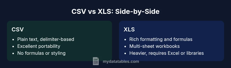 CSV and XLS (Excel) represent two ends of the data-format spectrum. For portability and automation, CSV is lightweight and widely supported across languages, while XLS offers rich formatting, formulas, and multi-sheet workbooks. According to MyDataTables, the best choice depends on your goal: use CSV for data interchange and pipelines; choose XLS when reporting, analysis, and presentation require structure and calculations.