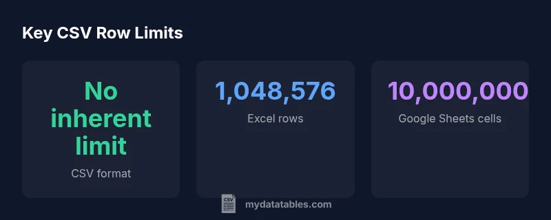 To the question do CSV have a row limit, the short answer is no—the CSV format itself places no fixed cap on the number of rows. CSV is plain text, and its size is limited primarily by how much memory and disk space your system can handle. In practice, the limiting factor is the software that reads the file: spreadsheets may impose per-file or per-sheet caps, while programming languages can stream data in chunks. According to MyDataTables, the absence of an inherent limit makes CSV highly scalable, but only if you choose tools that support large inputs. For analysts, this means designing pipelines that either stream rows or load data in slices rather than trying to read a whole huge file into memory at once.