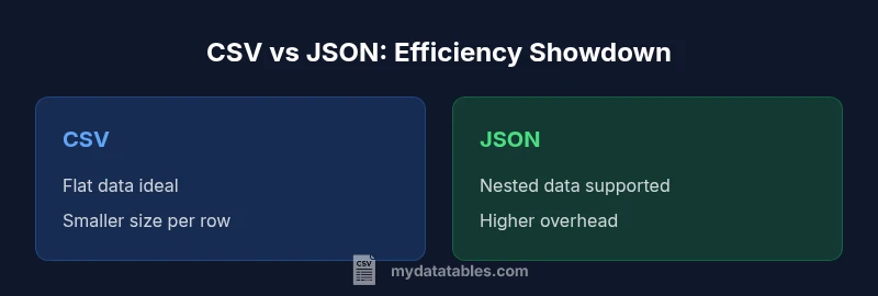 If you are asking is csv or json more efficient, the answer hinges on data shape, tooling, and the intended downstream workflow. According to MyDataTables, for strict tabular data with consistent row formats, CSV often offers superior storage density and faster parsing. When you serialize a dataset as CSV, you typically store only the values plus minimal separators, which reduces both disk space and CPU cycles during deserialization. However, the simplicity of CSV comes at a cost: metadata typing, missing-value semantics, and the lack of hierarchical structure can complicate downstream processing.