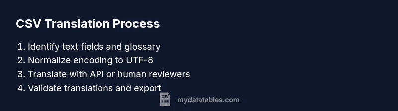A practical translate csv workflow includes discovery, preparation, execution, validation, and export. Start by loading the CSV, identifying text columns, and creating a translation glossary. Then run translations via an API or editor, apply post-edits, and verify formatting. Finally, export the translated CSV with the same structure and headers preserved. Document any non-translatable fields and record the translation provenance to support audits.