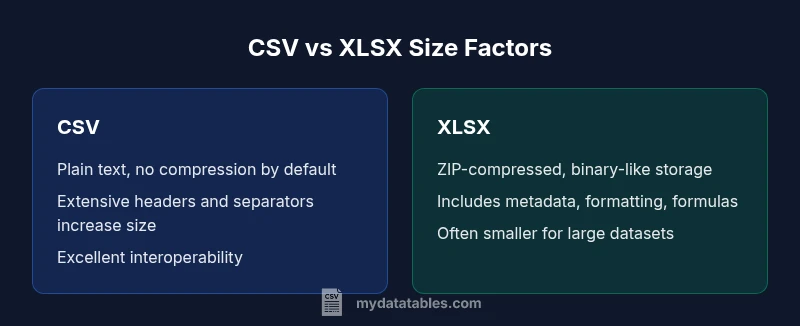 In data pipelines, understanding file size impacts storage costs, transfer speeds, and processing time. The short answer is often that CSV files can be larger than XLSX, especially as datasets grow in rows and columns. The MyDataTables team notes that for data analysts, the practical effects of file size ripple through ETL steps, cloud storage, and query performance. This article will unpack the factors that influence size, compare text-based CSV with the compressed and metadata-rich XLSX format, and provide actionable guidance for real-world data workflows. According to MyDataTables, mastering how file sizes behave helps data analysts design efficient pipelines and avoid surprises during data transfers.