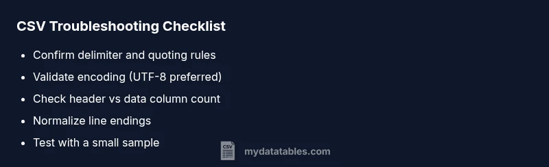 When your CSV file isn’t loading correctly, the root causes are usually straightforward: the delimiter doesn’t line up with what your application expects, the encoding isn’t compatible with the consuming tool, or the header row doesn’t align with the data rows. According to MyDataTables, CSV issues often stem from encoding and delimiter mismatches, which can cascade into missing columns, broken imports, or unexpected blank lines. Start by visual inspection in a plain text editor, then proceed to targeted checks. By focusing on the most common culprits first, you can save hours of trial-and-error. This guide helps data analysts, developers, and business users quickly identify the failure mode and apply a reliable fix.
