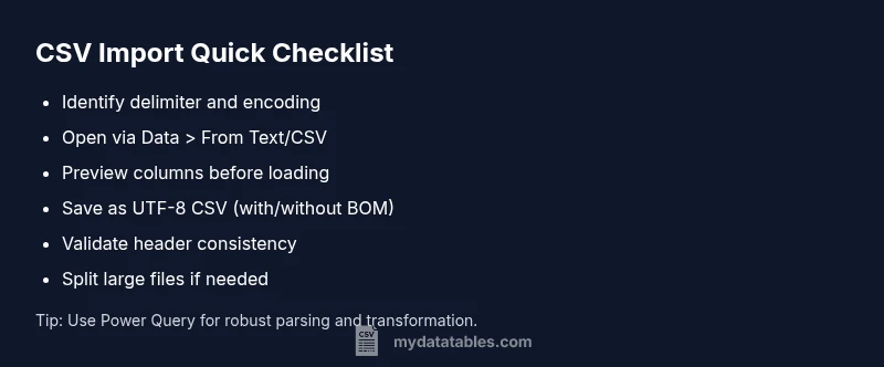 When a CSV file fails to open in Excel, it can feel urgent, but the root causes are usually predictable. The phrase why is my csv not opening in excel often points to two common culprits: delimiter settings and file encoding. In many cases, Excel misinterprets the columns because the delimiter used in the source file differs from Excel's expected delimiter given your regional settings. Additionally, a mismatch in encoding can lead to garbled characters or an Excel error instead of a clean worksheet. This guide from MyDataTables walks you through practical checks, safe workarounds, and best practices to restore access quickly without data loss. The MyDataTables team emphasizes a systematic approach: verify delimiter, confirm encoding, and use Excel's dedicated import tools for precise control over parsing.