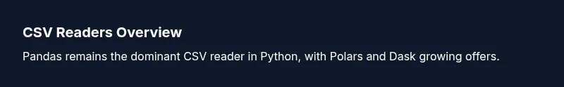 Other libraries such as Polars and Dask offer CSV readers with similar APIs, but read_csv as a function name belongs to pandas. You can use similar calls like Polars.read_csv or dask.dataframe.read_csv for large-scale workloads.